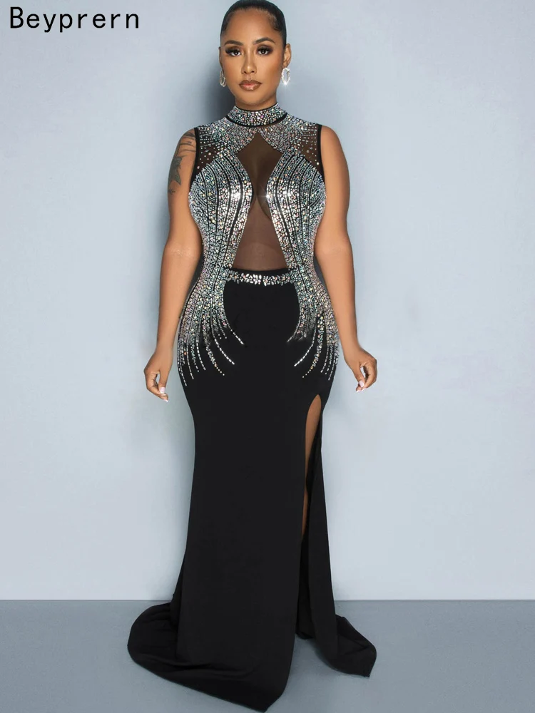 Beyprern Black Mesh Bust Rhinestones Décor Dress